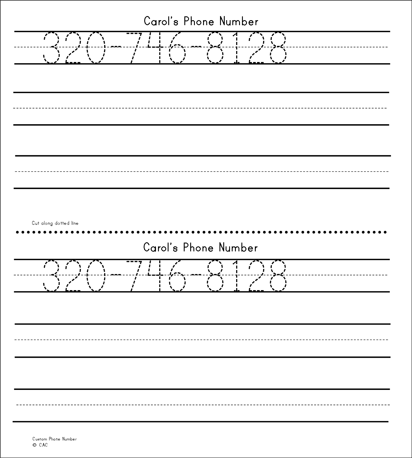 Carol's personalized phone number packets are customized for each child. Each packet will include 50 pages. This is a great educational tool to help children learn their phone number.